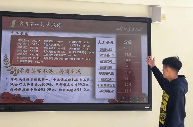 勤奋刻苦、勇于探索,连续三年综合测评和学业测评成绩排名专业第一。以赛促学,在学术竞赛中突破专业思维;以研促思,在学术科研中深化专业认知。同时发表一项国家实用新型专利和建筑设计作品期刊,具备扎实的学科基础和学术能力。
