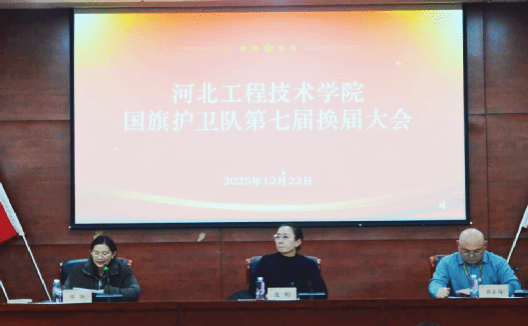 为进一步加强国旗护卫队组织建设,健全管理体系,强化队伍凝聚力与战斗力,12 月 22 日下午 15 时,河北工程技术学院国旗护卫队第七届换届大会在图书馆会议中心报告厅隆重举行。学生工作处(武装部)部长连婷,学生工作处副处长张静、乔志奇,国旗护卫队指导教师范杨、李国栋,国旗护卫队全体队员参会,共同见证队伍的薪火传承,本次大会由学生工作处副处长张静主持。